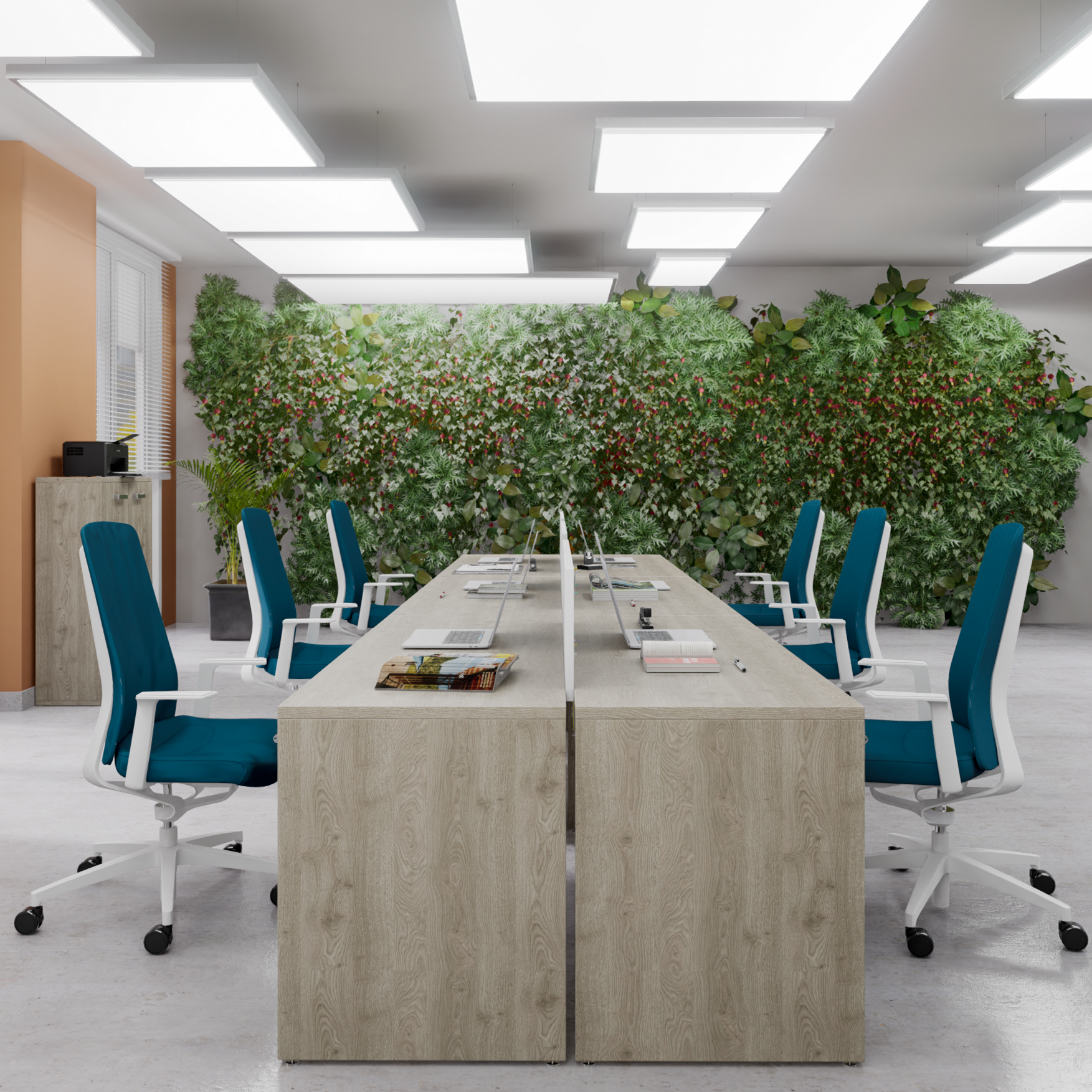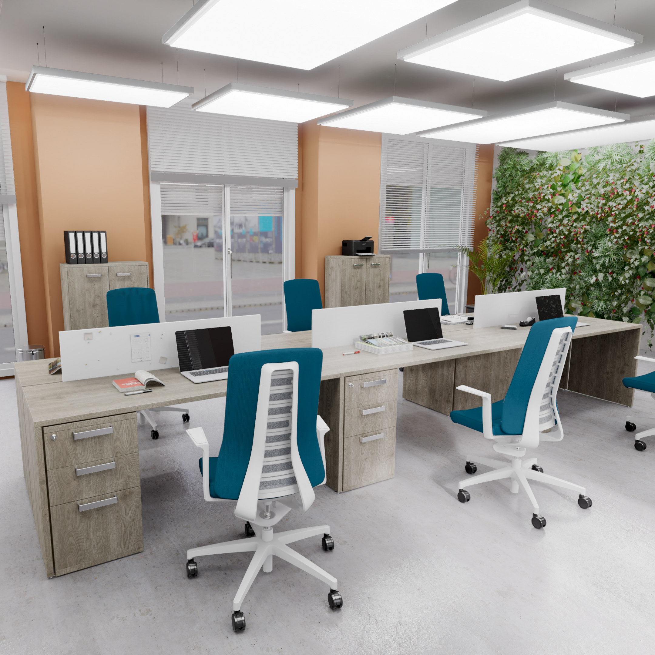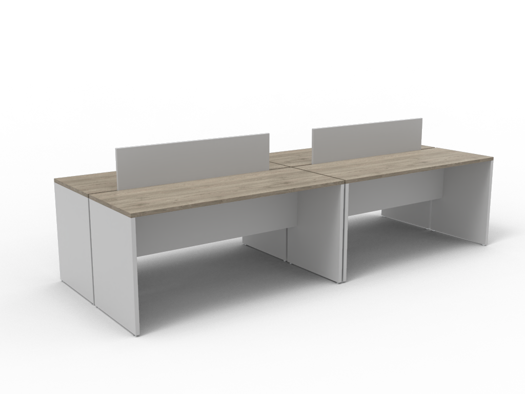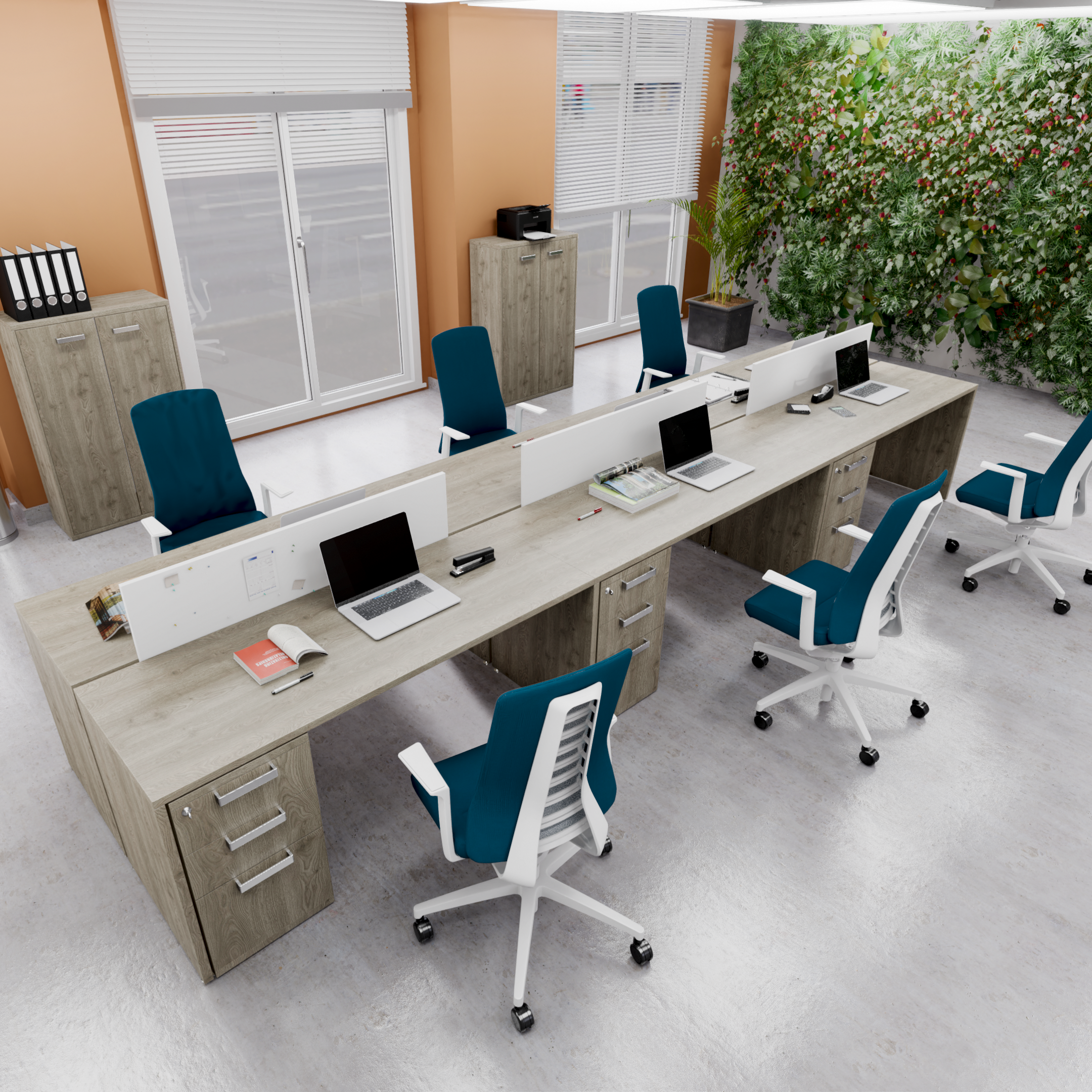 Estación de trabajo configurable para 2,4,6,8 personas. Mamparas de división entre usuarios disponibles en melamina.