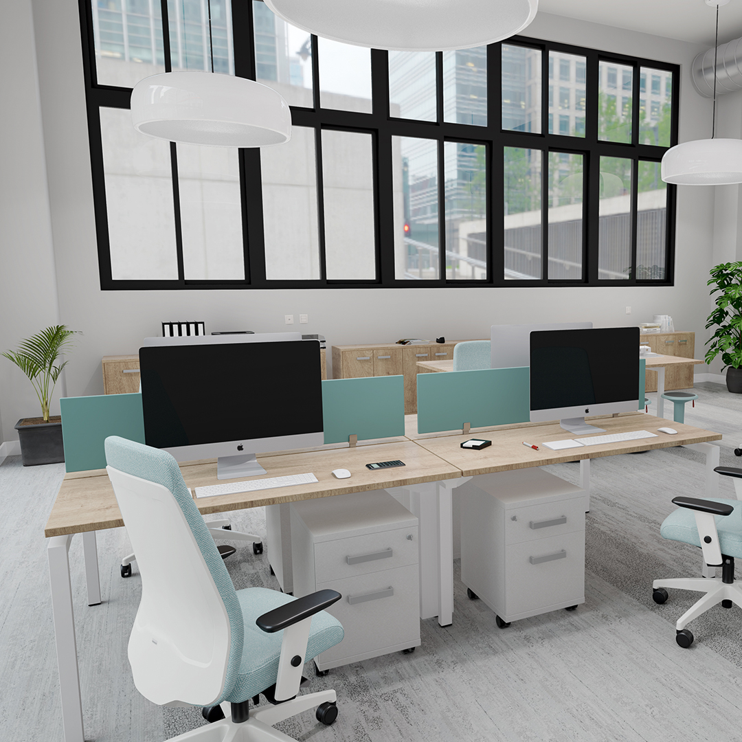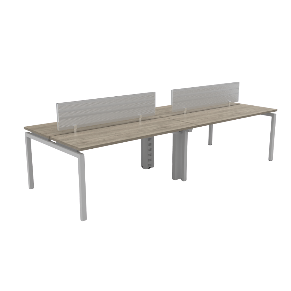Estación de trabajo configurable para 2,4,6,8 personas. Mamparas de división entre usuarios disponibles en melamina o aluminio pulido.
