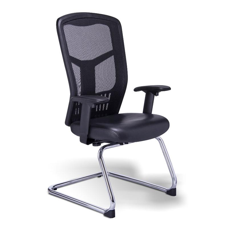 Silla ergonómica para oficina con descansa brazos con ajuste de altura ajustables y codera de poliuretano con alma de acero y cubierta en aluminio pulido. Acojinamiento del asiento en poliuretano inyectado de 53 kg/m³ de densidad con retardante de flama, tapizado en fina piel. Respaldo mesh. Ajuste de profundidad de respaldo.